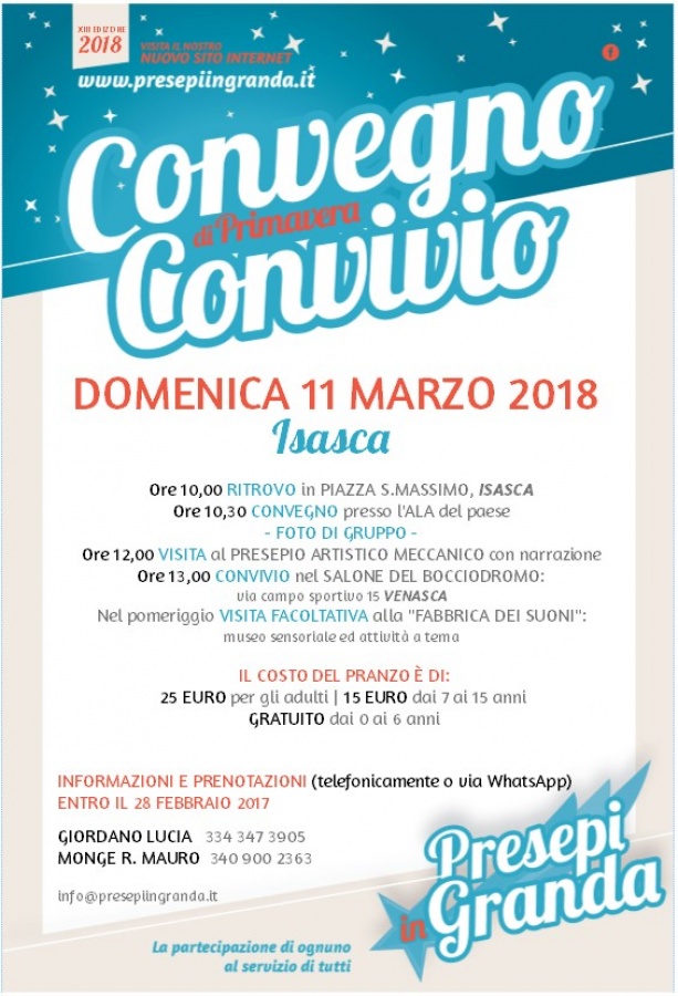 Sarà il gruppo di Isasca ad ospitare l'edizione 2018 del Convegno Convivio Presepiingranda, l'annuale appuntamento per gli appassionati iscritti al progetto, per condividere le proprie esperienze e programmare l'attività per il Natale 2018.
