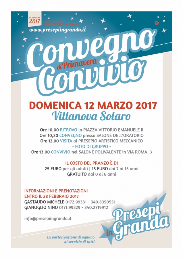 Organizzato dagli amici di Villanova Solaro, torna esattamente dopo 12 anni, il Convegno Convivio di Primavera dedicato a tutti gli appassionati di presepi e ai sostenitori del progetto Presepiingranda. Domenica 12 marzo l'appuntamento prevede alle ore 10,30 il tradizionale Convegno presso il Salone dell'oratorio. Sarà un momento per conoscere Presepiingranda, scambiarsi opinioni e idee sul Natale appena trascorso nonchè mettere in progetto eventuali iniziative per il prossimo 25 dicembre.