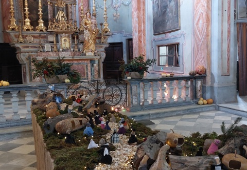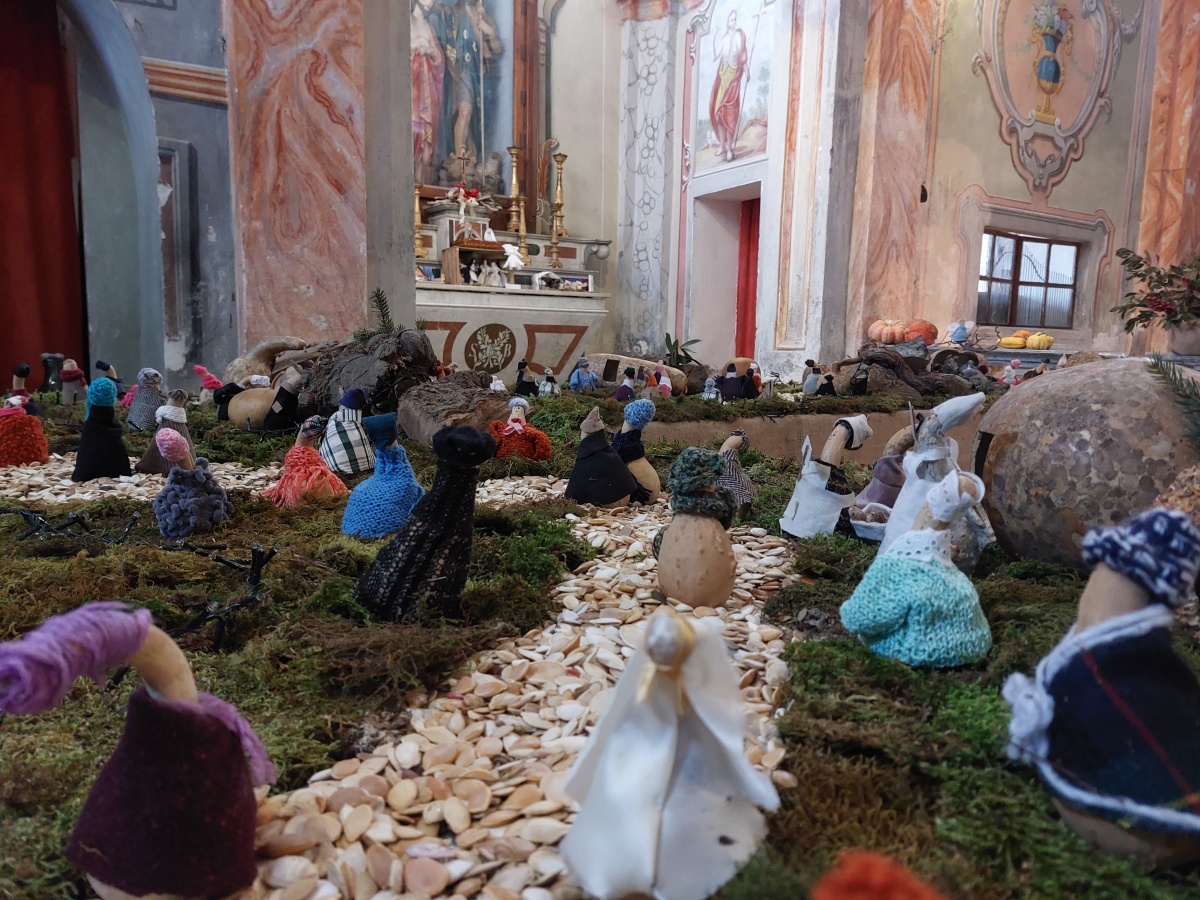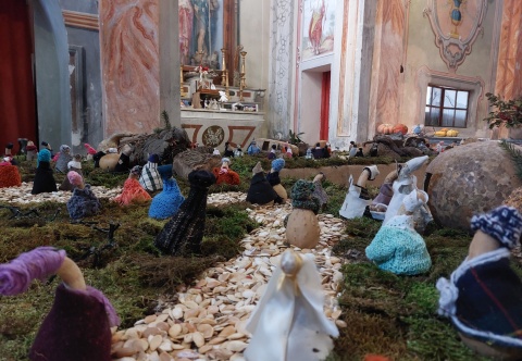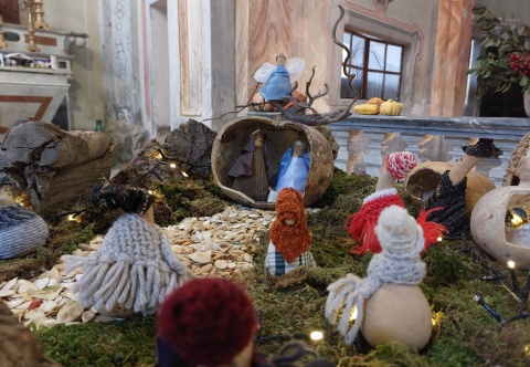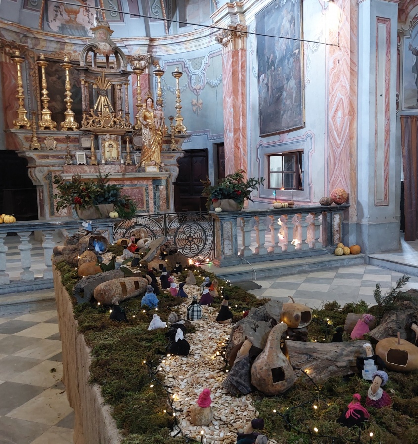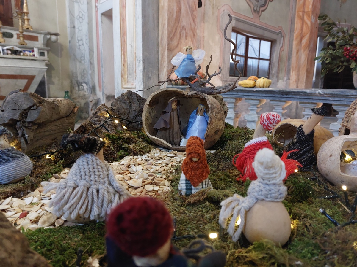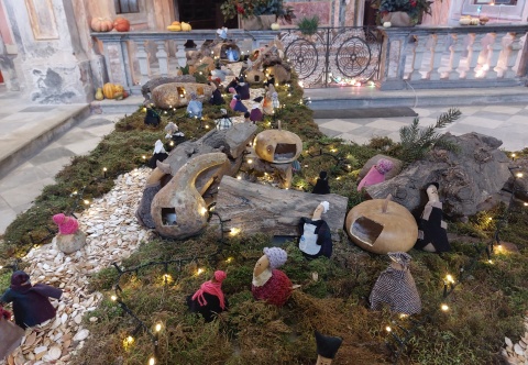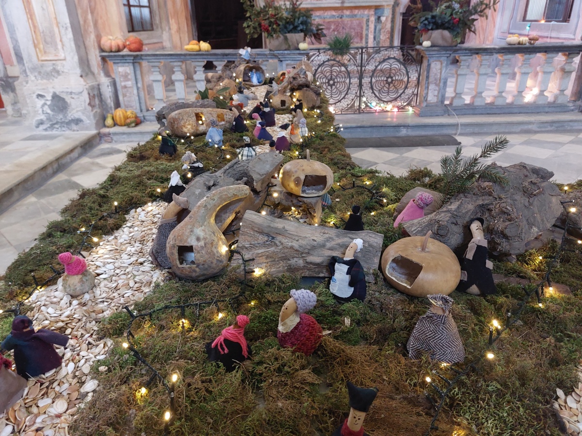 Tutti i personaggi del presepe sono realizzati con zucche essiccate , prodotto tipico coltivato a Piozzo.